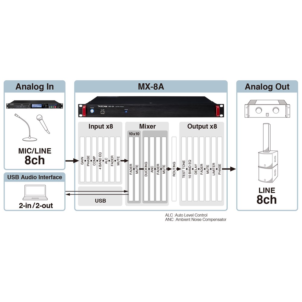 ■ Features 8-channel Mic/Line input with phantom power (+48v) support Supports remote mic gain control 8 line output Analog input / output adopting Euro block terminal suitable for Contractor Built-in a variety of DSP functions for optimal use in different scenes/environments Remote control via Ethernet 2 types of user control software available for Windows/Mac/iOS/Android devices TASCAM MX CONNECT (For Integrator) Designed for integrators that handle the configuration and settings of an entire system Routing selection, DSP/design/scene settings of the complete system, etc. TASCAM EZ CONNECT (For end users) Designed for end-users and allowing them to use simple controls Simple app design for only the necessary functions such as area volume settings, etc. Flexible scene preset function allows to work in different area situations (Up to 50 presets) Timer event function allows to automatically switch scenes at a specified time (Planned to be compatible on a future version update) 2 in / 2 out USB audio interface(Enable playback and recording of external software (WMP, iTunes, DAW) by connecting with computer, tablet and smartphone) Equipped with RS-232C serial terminal for external control, you can have a flexible system 1U mountable size Optional product Wall mount controller* that can adjust the volume etc. via RS-485.(Planned to be released in the future) ■ SpecificationsGeneralFORMAT 44.1k/48kHz, 16bit/24bitInput/output ratingsUSB port 4-pin USB B-typeTransfer rate USB 2.0 High Speed (480 Mbps)ANALOG IN connectors Euroblock (balanced) 3.81mm pitchMinimum input level −70 dBuMaximum input level +26 dBuInput impedance 2.2 kΩ or higherANALOG OUT connectors Euroblock (balanced) 3.81mm pitchNominal output level +4dBu (when Ref.Level set to other than -9dBFS), +6dBu (when Ref.Level set to -9dBFS)Maximum output level (switchable) +15dBu (Ref.Level: -9dBFS), +18dBu (Ref.Level: -14dBFS), +20dBu (Ref.Level: -16dBFS)+22dBu (Ref.Level: -18dBFS), +24dBu (Ref.Level: -20dBFS)Output impedance 200 Ω or lowerRS-232C connector D-sub 9-pin (female, inch-standard)RS-485 connector RJ-45Cables Category 5e or faster STP cablesEthernet connector RJ-45Transmission protocol TCP/IPEthernet standard 100BASE-TXCables Category 5e or faster STP cablesNote: 0dBu=0.775VrmsAudio performanceMic amp EIN (equivalent input noise) -126 dBu or less (MIC IN → LINE OUT, Input impedance: 150 Ω, 22 kHz LPF, A-weighted, JEITA)Frequency response ±0.5 dB: 20 Hz – 20 kHz(+24 dBu input, MIC IN → LINE OUT, GAIN MIN, JEITA)Distortion (THD+N) 0.005 % or less(+24 dBu input, 1 kHz, MIC IN → LINE OUT, GAIN MIN, JEITA)S/N ratio 106 dB or higher(+24 dBu input, 44.1 k/48 kHz sampling frequency, MIC IN → LINE OUT, GAIN MIN, JEITA)Crosstalk 106 dB or higher(+24 dBu input, 1 kHz, MIC IN → LINE OUT, GAIN MIN, JEITA)Dynamic range 106 dB or higher(MIC IN → LINE OUT, GAIN MIN, JEITA)Note: JEITA indicates compliance with JEITA CP-2150Supported audio driversWindows UAC2.0, WDMmacOS/iOS UAC2.0Android UAC2.0OtherPower AC100-240 V, 50/60 HzPower consumption 21WDimensions 483 x 45 x 304.1mm (W x H x D, including protrusions)Weight 3.0kgOperating temperature range 0°C–40°CIncluded items Power cord x 1, Euroblock plug x 16, Cable band kit x 1, Rackmount screw kit x 1, Owner's Manual (including warranty) x 1