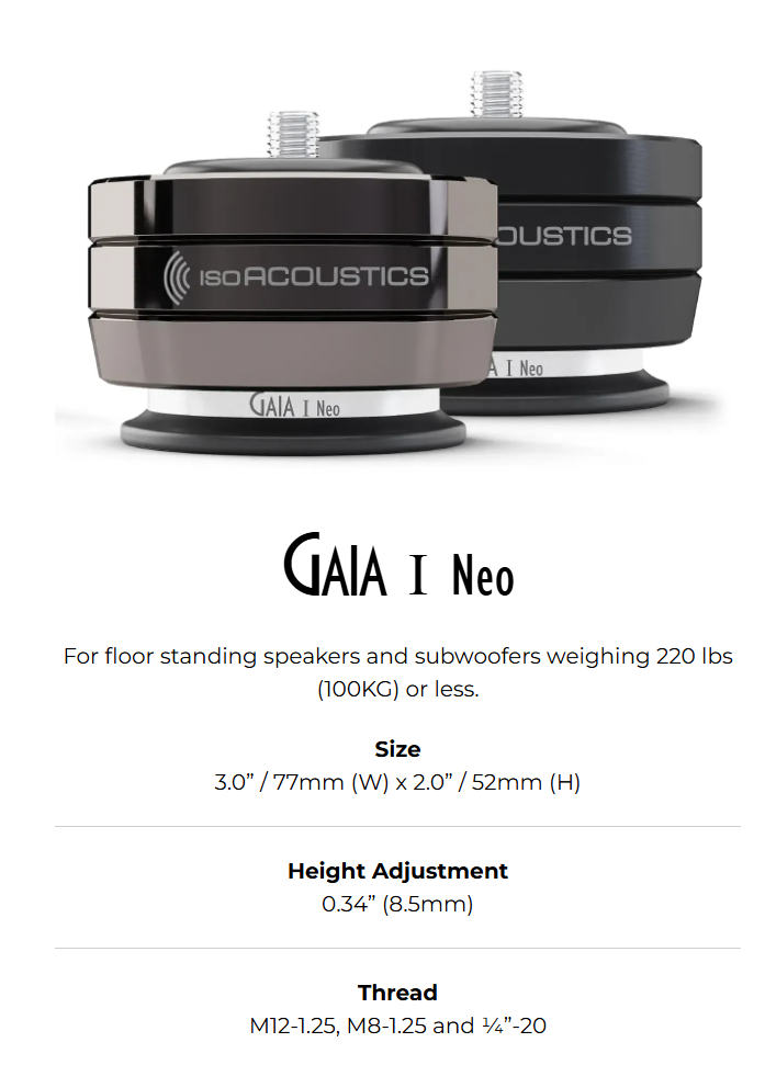 The GAIA Neo series represents the latest advancement in IsoAcoustics’ acclaimed line of speaker isolation feet. Building on the success of the original GAIA models, the Neo version features several enhancements, such as effortless height adjustment, superior isolation capabilities, easier installation, and a stylish modern design available in black or dark chrome.