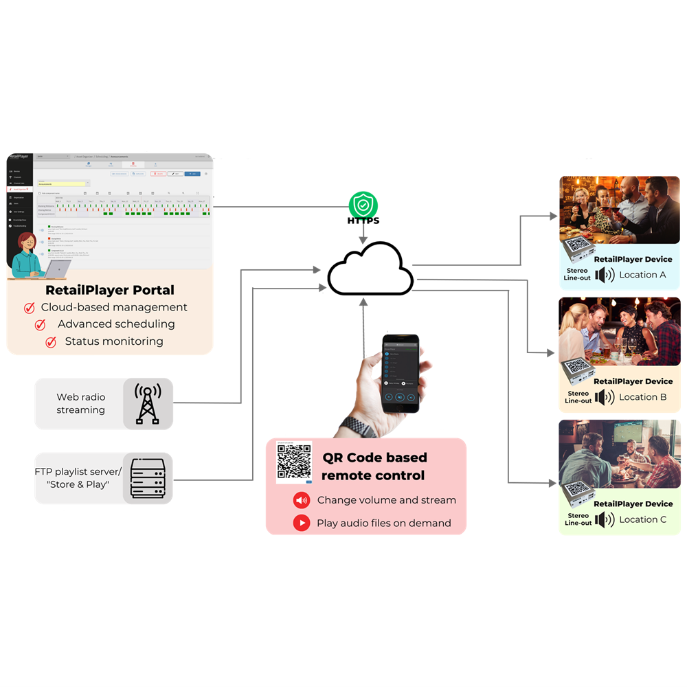 RetailPlayer S400Sophisticated background music player for retail applications.The RetailPlayer is the best valued streaming player for multi-channel streaming of background music. It is a rock-solid metal device that needs little maintenance and can be installed almost everywhere by anyone. A wide variety of Audio Formats from independent streaming services are supported and played on a standard Line Level output. The online management portal allows for convenient control of the playout and supports status monitoring and firmware management for every device. Fallback Stream and local Failover Playlist are also supported in stand-alone operation. Barix Products are developed in Switzerland.