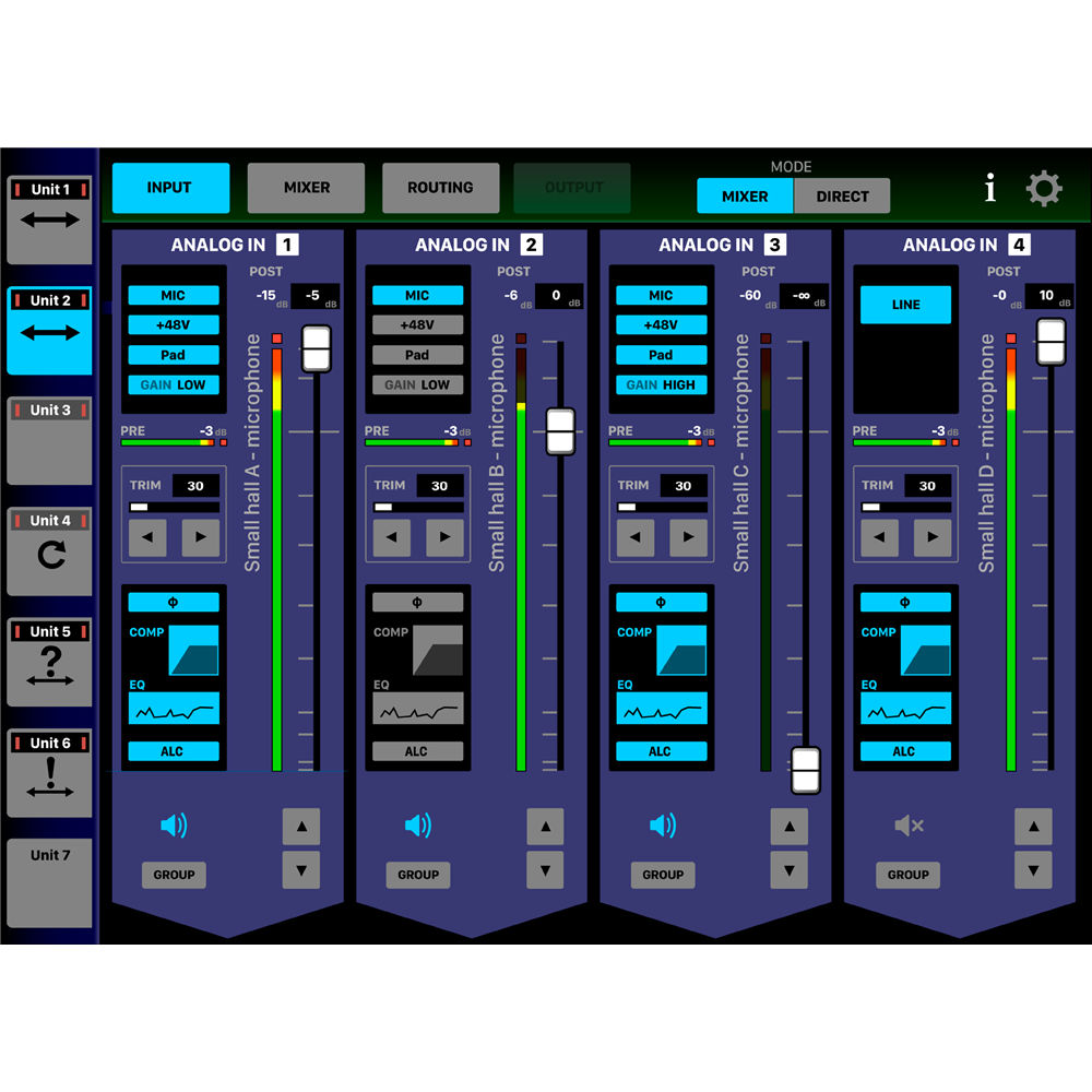 Flexible routing allows users to choose the output zone of 4 mic/line inputs or the built-in matrix mixer output zone as 4 Dante output. The MM-4D/IN-X can also be used as a simple mic/line input unit by bypassing the matrix mixer.