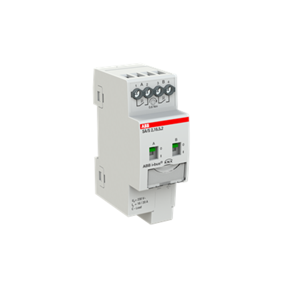 • Long Description: The switch actuator uses potential free contacts to switch 2 independent electrical loads via the ABB i-bus® KNX. The device features a manual operation and displaying of the switching state of the outputs. The 16/20 A, 16 A-AC3 (C-load) device is especially suited for loads with high surge currents e.g. flourescent lighting acc. EN 60669.