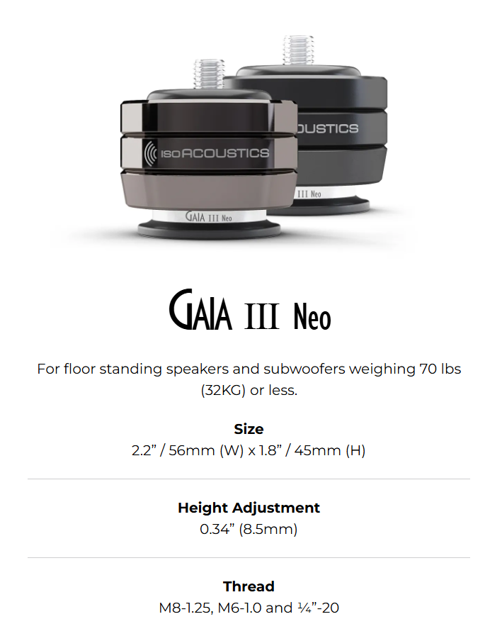 The GAIA Neo series represents the latest advancement in IsoAcoustics’ acclaimed line of speaker isolation feet. Building on the success of the original GAIA models, the Neo version features several enhancements, such as effortless height adjustment, superior isolation capabilities, easier installation, and a stylish modern design available in black or dark chrome.