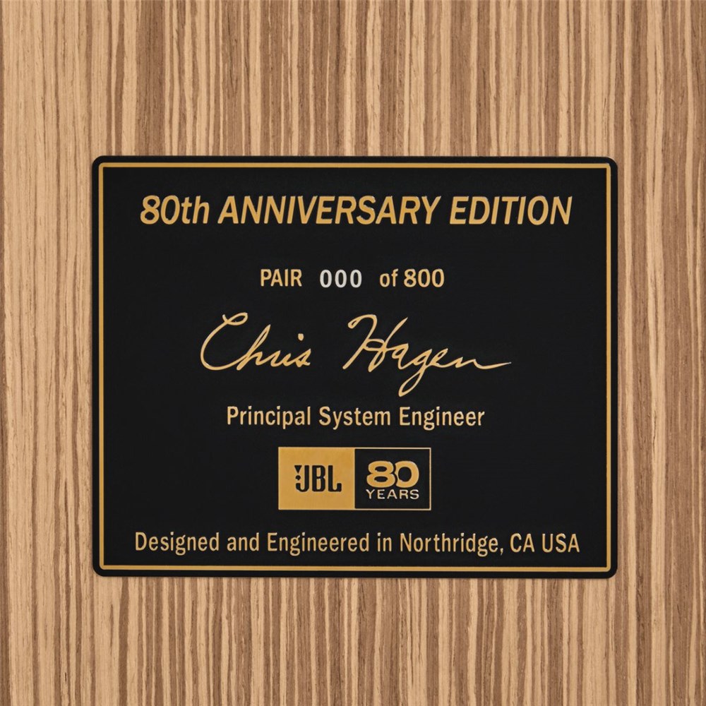 This Limited-Edition JBL L100 Classic loudspeaker package commemorates JBL's 80 years of excellence in audio. The L100 Classic 80 showcases a stunning oak wood veneer enclosure, paired with a brown Quadrex foam grille that features a gold and black JBL logo, all framed in sleek black satin wood. Each speaker is adorned with anniversary edition badges on both the front and back, including a unique numbered plaque signed by principal system engineer Chris Hagen, indicating its place in the limited production run. Sold as a matched pair, the L100 Classic 80 comes with a set of JS-150 floor stands and is delivered in a specially designed wooden crate. With only 800 pairs available globally, this edition is truly a collector's item.