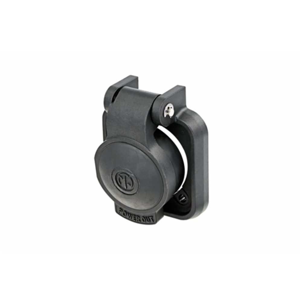 The spring-loaded sealing self-closing cap NSSC-2 for powerCON receptacles shuts automatically after unplugging the cable connector and seals the chassis connectors against dust and water to IP65.