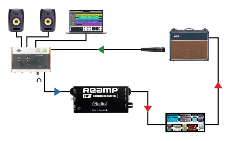 The Reamp HP connects directly to the headphone jack on your audio interface, so you don’t have to re-plug or use up limited outputs. Connect the output of the Reamp HP to your pedals and an amplifier and record the results back into your audio software.