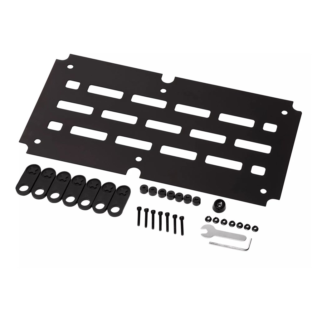 The innovative Base Plate is a universal mounting solution, perfectly matched to the respective RockBoard® and provides a perfect extension of the board management for any application. The completely flat, powder-coated black surface, made of lightweight 2.0 mm cold-rolled aluminum and completely warp-resistant, provides an additional level. The construction of the vertical support braces gives the Base Plate additional stability. Using the holes in the slot design of the Base Plate´s surface, you can mount power supplies, effects, buffers, etc. by using our QuickMount® system, cable ties, or hook and loop tape. With a simple twist of the locking latches, the Base Plate can be opened in a flash. No additional drill holes are required for quick and easy mounting, the appropriate mounting materials are of course included.