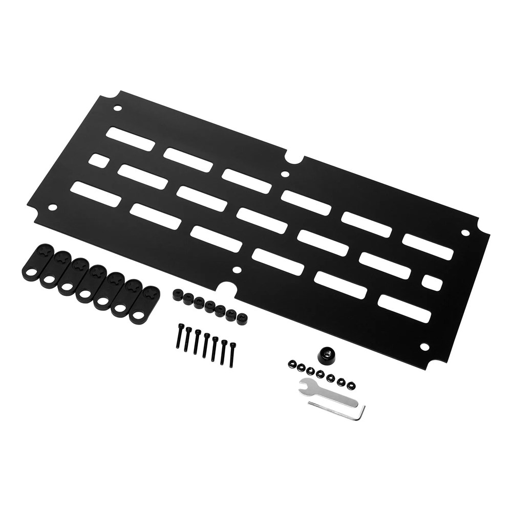 The innovative Base Plate is a universal mounting solution, perfectly matched to the respective RockBoard® and provides a perfect extension of the board management for any application. The completely flat, powder-coated black surface, made of lightweight 2.0 mm cold-rolled aluminum and completely warp-resistant, provides an additional level. The construction of the vertical support braces gives the Base Plate additional stability. Using the holes in the slot design of the Base Plate´s surface, you can mount power supplies, effects, buffers, etc. by using our QuickMount® system, cable ties, or hook and loop tape. With a simple twist of the locking latches, the Base Plate can be opened in a flash. No additional drill holes are required for quick and easy mounting, the appropriate mounting materials are of course included.